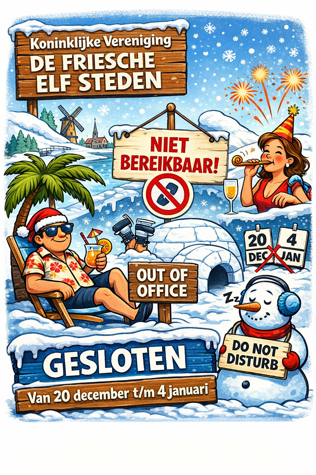 Van zaterdag 20 december 2025 tot en met zondag 4 januari 2026 is de Koninklijke Vereniging De Friesche Elf Steden tijdelijk niet bereikbaar.
