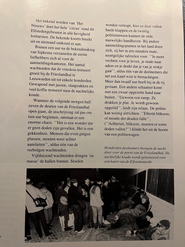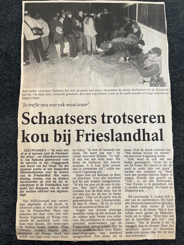 18 februari 1985 wordt Elfstedentocht aangekondigd. Ik, Jacob, 19 en mijn vader Tjip, 52, zijn niet lid. Ik ga met een vriend naar Leeuwarden en sta daar de hele nacht in de vrieskou voor deur. Deuren gaan open en ik koop 2 kaarten.